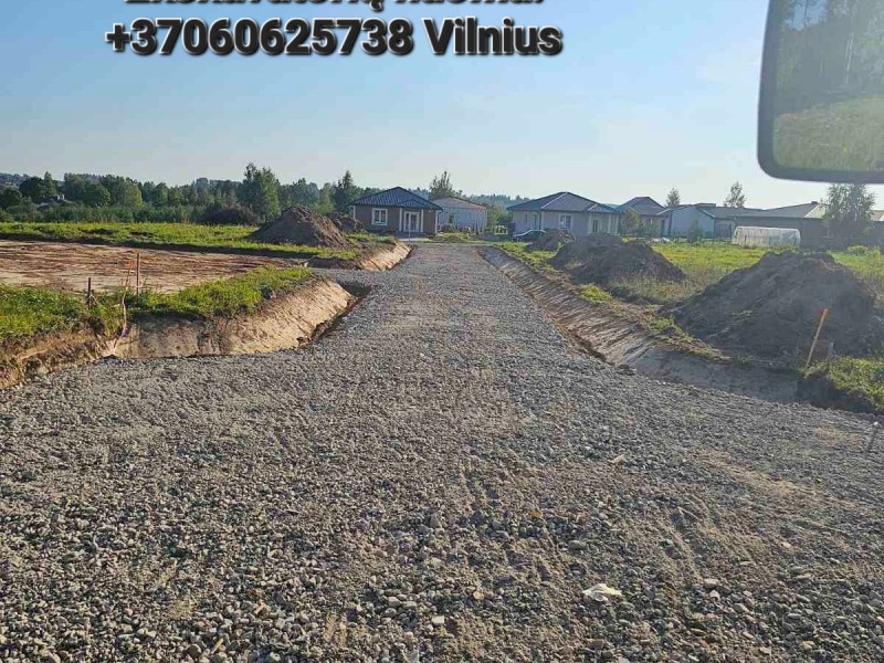 Tvenkinių, prūdų kasimas, šlaitų formavimas, kelių įrengimas/ išlyginimas, ruošiame įvažiavimus į sklypus, atliekame pagrindus keliams, namų statybai, trinkelių klojimui, užkasame griovius, grunto atvežimas, pervežimas, pakrovimas, nuėmimas, žemės kasimas, lyginimas, planiravimas, stumdymas, užpilame pamatus, tranšėjų kasimas, duobių pamatams kasimas, juostinių pamatų kasimas, juodžemio, augalinio sluoksnio skleidimas, sklypo reljefo tvarkymas, kanalizacijos žiedų montavimas, polių gręžimas ir kiti panašaus pobūdžio darbai.